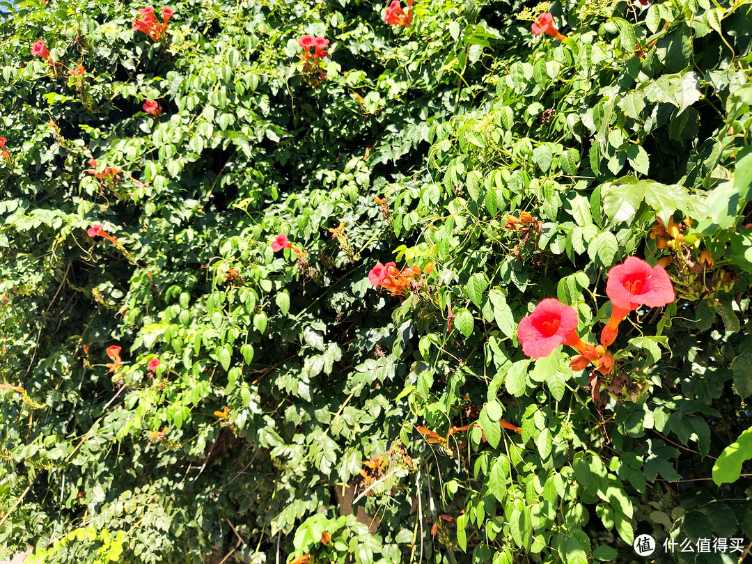 一朵朵橘红的小花儿,或单门独户,或三五成群,它们愉快的吹着小喇叭,在那油绿发亮的绿叶儿陪衬下,与散发缕缕暖香的骄阳映衬着,显得格外炫目。微风轻轻拂过,羽状的复叶掀起绿色的波涛,此起彼伏,很是漂亮!它们就是凌霄花。今天上午,在办完事回来的路上,遇到了这一情景,情不自禁的拿起手中的米九手机,把它们记录了下来,请大家一起来分享。